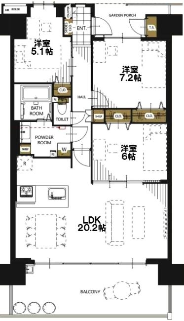 ◆ 「駐車場が1台無料で利用できる」のは大きな魅力ですね。 専有面積は、82㎡・3LDKとゆとりがあり、各居室にゆったりとした広さが確保されています。 収納面では、玄関前のトランクルームがアウトドア用品や道具類の保管に重宝します。室内はリビングや洋室(7.2帖・6帖)の柱が外に出た設計(アウトフレーム工法)なので、四隅までスッキリしており、家具の配置に困ることはないでしょう。 キッチンは吊戸棚のないオープンタイプで、視界が開けており、開放感たっぷりで調理を楽しめます。また、バルコニーも奥行きのある広い造りになっており、全体的に開放感と機能性がバランス良く備わったお部屋ですね。