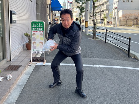 ゴミ袋を抱えて敵?を交わして、
