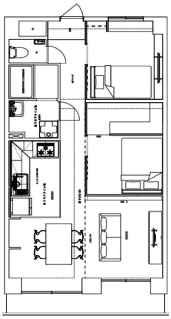 ◆ 玄関横の洋室には、エアコンが設置可能です。一方、真ん中の洋室は不明なので、現地を確認しておきましょう。また、玄関からリビングまで扉がないので、空調が少し気になるところです。リビングがL字型になっていますので、ダイニングとリビングを使い分けしやすい間取りですね。